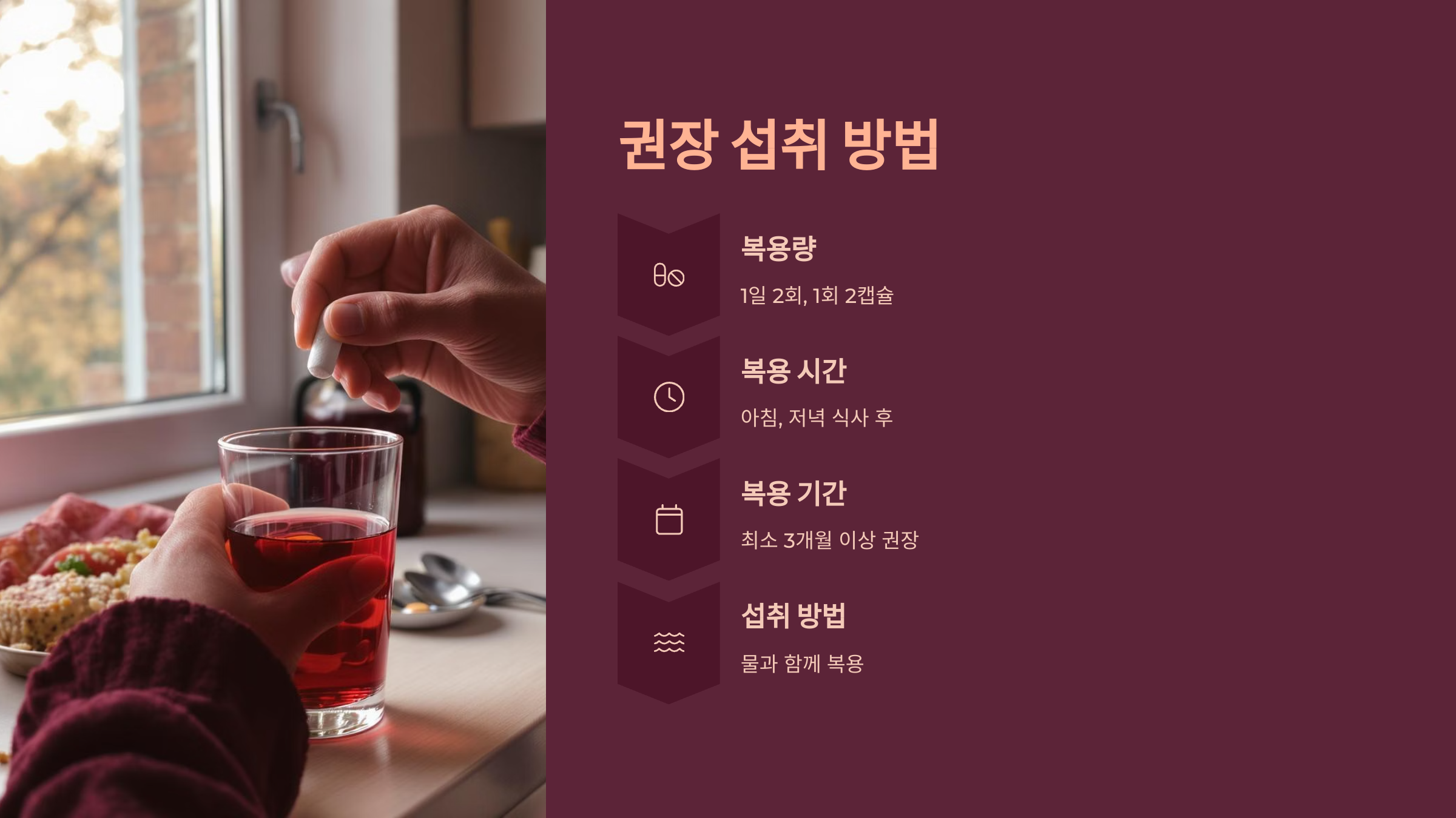 ※ 제품에 따라 캡슐 수량, 복용 방법은 조금씩 다를 수 있으므로 구입하신 제품의 라벨을 꼭 참고하시길 권장합니다.